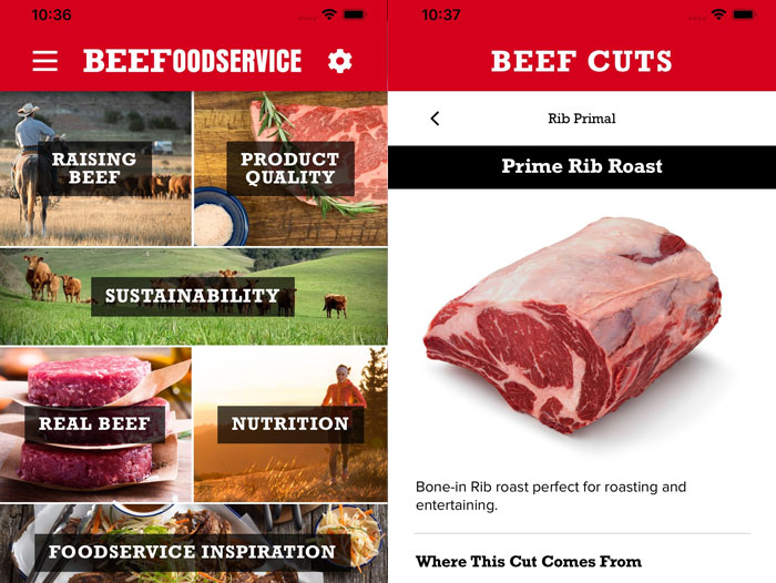 BEEFoodservice is ultimately a guide and resource for foodservice professionals about beef. App users can learn how cattle are raised, beef’s sustainability story, product quality and beef nutrition. Through the comprehensive Beef Cuts section, the foodservice community can explore innovative beef cuts and their versatility in menu applications, NAMP/IMPS ordering numbers and tips, cut preparation tips and cooking methods. App users can watch beef cutting videos and complete one of two interactive beef training courses. Topics of the BEEFoodservice app include Raising Beef, Product Quality, Sustainability, Real Beef, Nutrition, Foodservice Inspiration and Beef Cuts. The app also includes two free beef training programs, an inbox messaging feature and the capability to connect with your local state beef council.