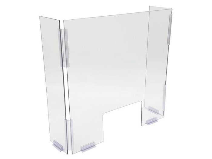 Easy to clean and no tools required for setup. Simply use panel connectors and siffron SuperGrip® holders to adhere sneeze guard to the counter/workspace surface.