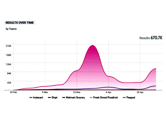International social media analytics firm, Talkwalker reports that all of the big players among grocery delivery services have had more than 28,000 percent more engagement in a two-month period of time (March 1 – May 1) from the previous two months. The five major brands had 7 million engagements in that time period as compared with 25,000 engagements between January 1 and February 29.