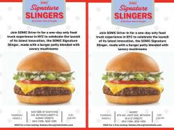 (OKLAHOMA CITY) –SONIC® Drive-In (NASDAQ: SONC) revamped the traditional American cheeseburger with its new SONIC Signature Slingers, a first of its kind in fast food. The perfect-sized cheeseburger patty is made with three simple ingredients: 100-percent pure beef blended with savory mushrooms and seasonings to create a juicy, flavorful patty that is almost too good to be true. Starting under 350 calories, the SONIC Signature Slingers lets you get away with all the flavor of a cheeseburger with none of the guilt starting at $1.99*.