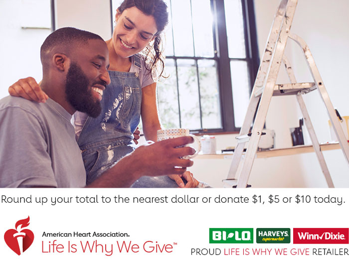 Now through Aug. 27, BI-LO, Harveys and Winn-Dixie customers can round up their purchase to the nearest dollar or make a donation at the register. Each dollar raised will help pave the way for the next generation of advancements in preventing heart disease and stroke.