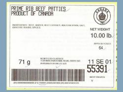 - 10 lb boxes of PRIME RIB BEEF PATTIES 71g, with product code 55391 and bearing a production code of 11 SE 01 or 12 JA 04