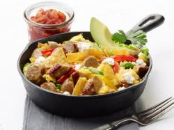 • Turkey Sausage Migas: Turkey sausage links, chili powder, Jack and Cheddar cheeses, yellow onions, green and red peppers, and crispy corn tortillas in a fluffy egg scramble.