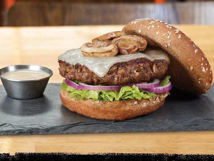 The Mushroom-Blend Burger features all-natural beef blended with mushrooms, melted Swiss, umami sauce, fresh lettuce, crisp red onions, topped with sautéed mushrooms and served on a toasted wheat bun. The Sweet Sriracha Brussels Sprouts feature fried Brussels Sprouts tossed in a sweet Sriracha sauce and sea salt.