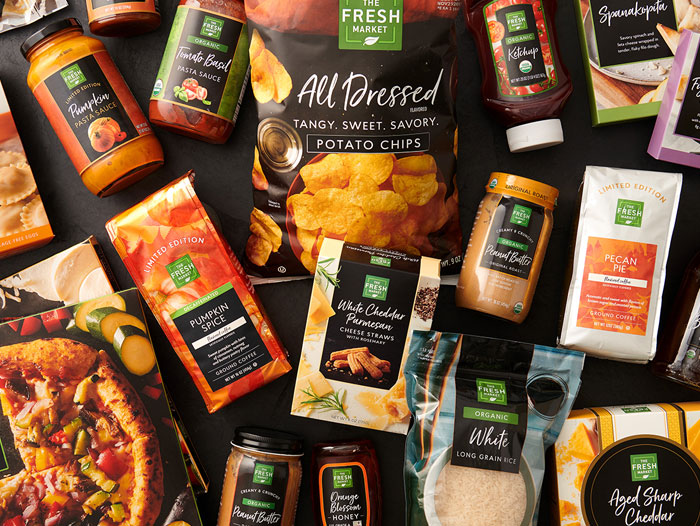 Seasonal private label items include The Fresh Market’s flavored coffees, snack mixes and cookies. For the fall, this includes more than 60 pumpkin flavored items (pasta sauce, salsa, coffee, cookies, hot cocoa, snack mixes, yogurt-covered pretzels, bakery items, etc.).