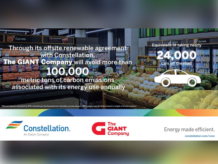 Carlisle, PA —The GIANT Company announced a long-term renewable energy supply agreement with Constellation, a leading competitive energy and energy solutions provider, to power its Pennsylvania operations including select stores, fuel stations, and perishable distribution center with renewable energy. The agreement will help The GIANT Company avoid more than 100,000 metric tons of Scope 2 carbon emissions associated with its energy use annually, the equivalent of taking nearly 24,000 cars off the road, according to U.S. EPA estimates.