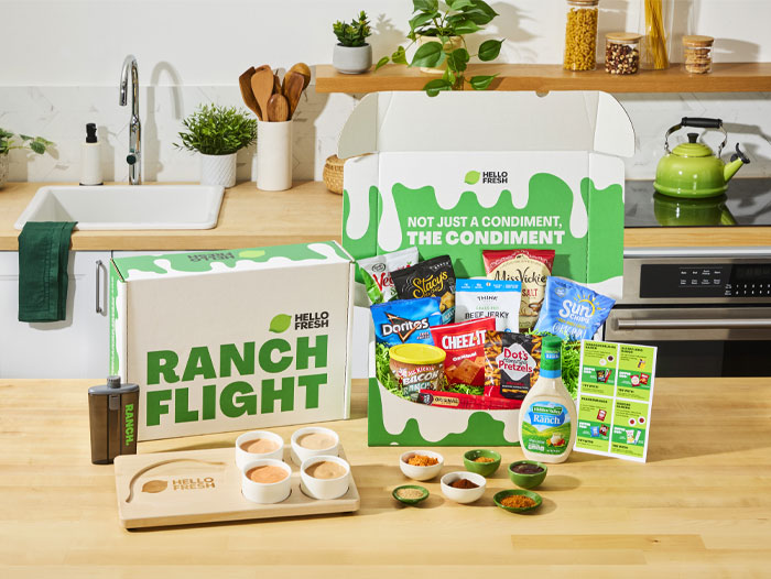 The HelloFresh Ranch Flight offers a delicious range of flavor profiles including GoGoGochujang Ranch (featuring Gochujang), All Bay Long Ranch (featuring Old Bay® seasoning), Frankenranch (featuring Frank’s RedHot® powder), and Goucho Rancho (featuring SouthWest seasoning), all expertly paired with crunchy and savory snacks including Miss Vickie’s® Kettle Cooked Chips, Cheez-It® Original, Stacy’s® Pita Chips, Garden Veggie Straws®, and more. There’s also an assortment of ranch-flavored snacks, for those who really want to level up their ranch-tasting experience. Whether you crave something spicy, tangy or savory, the HelloFresh Ranch Flight’s specially created flavor combinations promise to delight your palate and spice up snack time.