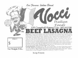 - 5-lb. steamer tin pans of “VOCCI ITALIAN FOODS BEEF LASAGNA” bearing the establishment number “EST. 5789” inside the USDA mark of inspection on the label.