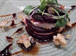 Top honors have been awarded to the Overall Winner, Chef Kristine Merten of Hy-Vee supermarket in Austin, Minnesota. In addition to the $300 prize for winning the small plates category, she received an Apple iPad for being the Overall Winner. The simplicity of her recipe highlights the ingredient flavors and textures. The presentation features layers of salt-roasted beet medallions and a filling of Mascarpone mixture with scallions, salt and pepper. It’s topped with a drizzle of red wine and balsamic reduction, then sprinkled with candied walnuts. The appetizer is finished by a garnish of micro greens atop the medallion tower.