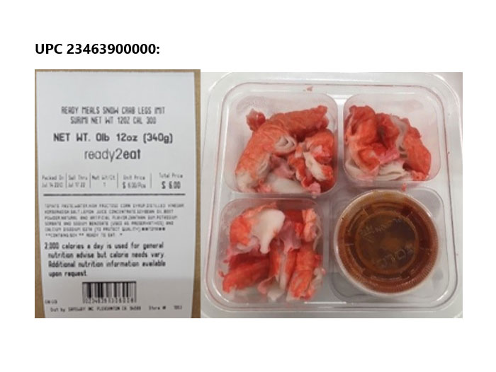 | ReadyMeals Snow Crab Legs Imitation Surimi | 12oz | Crustacean (Crab), Egg, Fish (Pollock Whiting, Anchovy), Wheat | Clear plastic container with four compartments | 23463900000 | All Sell Thru Dates up to and including July 18 | ACME, Albertsons, Andronico’s Community Markets, Balducci’s, Carrs-Safeway, Eagle, Jewel-Osco, King’s, Pak ‘N Save, Safeway, Shaw’s, Star Market, Vons | AK, CA, CO, CT, DE, ID, IL, IA, ME, MD, MA, NE,NH, NV, NJ, NM, NY, PA, RI, SD, VT, VA, WA, DC, WY |