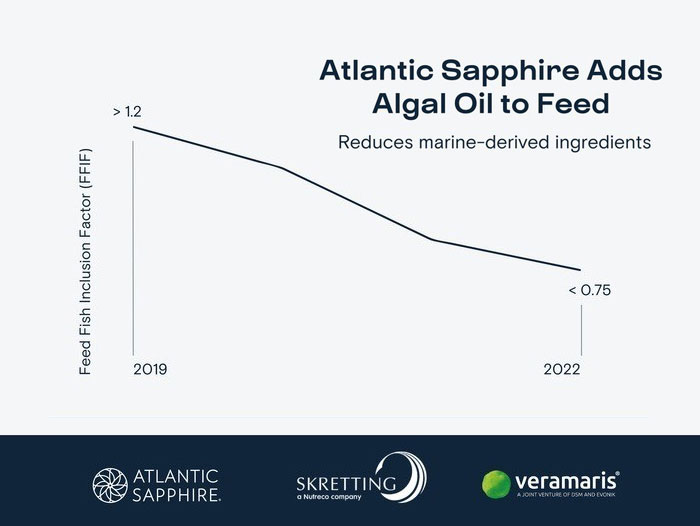 MIAMI and STAVANGER, Norway – The largest global land-based aquaculture company, Atlantic Sapphire ASA (“Atlantic Sapphire”; OSE:ASA / OTCQX: AASZF) is pleased to announce it has partnered with Skretting to include Veramaris ASC-MSC certified sustainable algal oil from Q4 2021, reducing the fish oil content in its salmon feed by approximately 25% and accelerating the process of eliminating the use of marine-derived feed ingredients by 2025.
