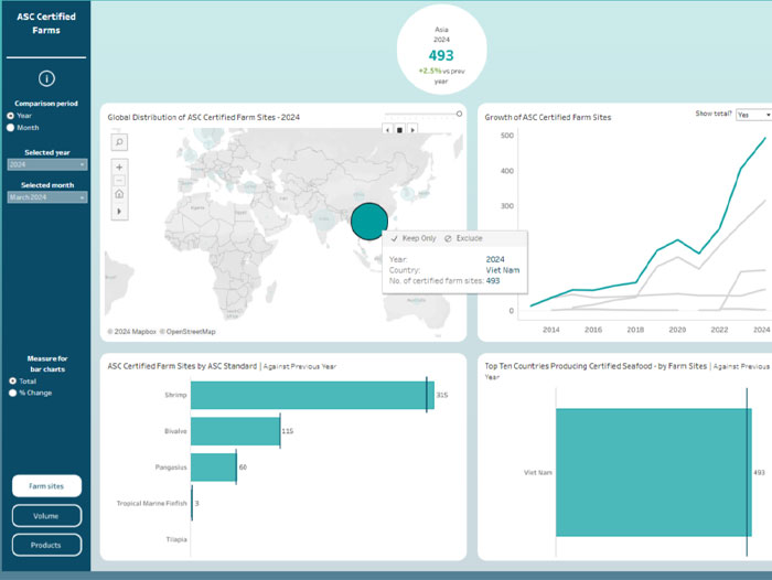 “For example, zooming in on Vietnam, users can see that the number of ASC certified farms has been steadily growing since 2021, with shrimp as the main species produced.