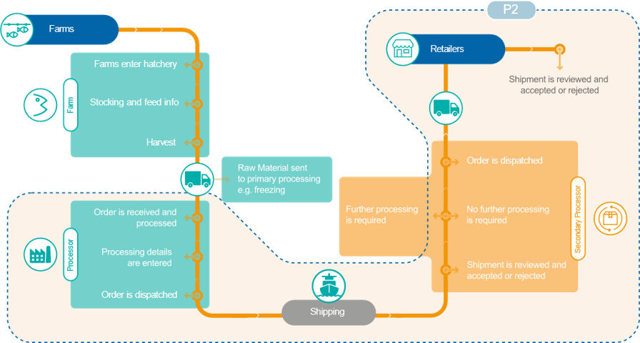 Relevant KDEs are captured, including a species’ scientific name, stock size and volume, source of broodstock, production method, country of origin and location of farm, movement and transportation documents, source and certification status of feed ingredients, processor type, date of freezing and sales documents. The data captured support traceability, which ultimately helps strengthen integrity and programme assurance.