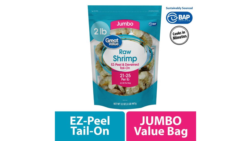 • Product Name: Great Value Frozen Raw Shrimp EZ-Peel & Deveined Tail-On 21-25 Per lb