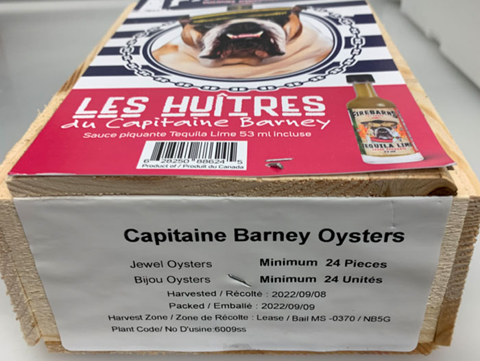| Capitaine Barney Oysters | Jewel Oysters with Firebarns brand Tequila Lime Hot Sauce | 24 pieces | 6 28250 88624 5 | Harvested: 2022/09/08Packed: 2022/09/09Harvest Zone: MS-0370/NB5GPlant Code: 6009ss | ||||