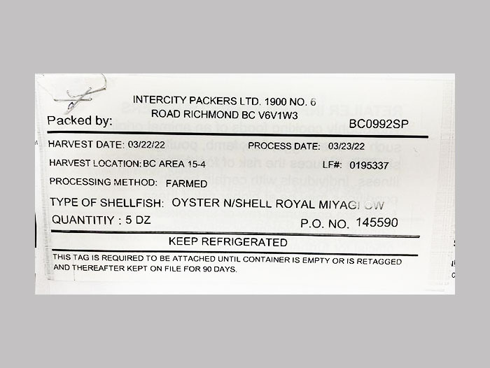 | Intercity Packers Ltd. | Oyster N/Shell Royal Miyagi Ow | Variable | None | Harvest Date: 03/22/22Process Date: 03/23/22Harvest Location: BC Area 15-4LF#: 0195337 |