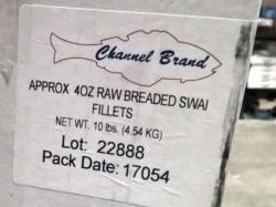 - 10-lb. corrugated box of “Channel Brand APPROX4OZ RAW BREADED SWAI FILLET,” with a lot code of 22888 and date codes of 17053 and 17054.