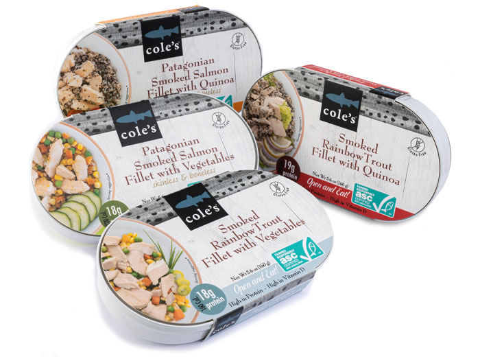 Cranston, R.I. – An on-trend and all-new ASC labeled tinned seafood product is about to make waves at grocery stores nationwide. This spring, Cole’s Seafood is introducing four new Open & Eat tinned seafood products made with Patagonian smoked salmon and smoked rainbow trout that are ASC certified as responsibly farmed. Each tin is a complete meal with a choice of quinoa or vegetables.