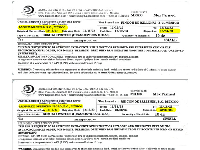 - Certain oysters from Baja California, Mexico from Acuacultura Integral De Baja California SA de CV – MX 4 SS from harvest area Laguna Manuela, B.C., Mexico harvested on 12/15/2023, 12/16/2023, or 12/23/2023 or Laguna De Guerrero Negro, B.C., Mexico, harvested on 12/15/2023, 12/16/2023, 12/19/2023, or 12/29/2023. The oysters were distributed to restaurants and retailers in California and may have been distributed to other states as well.