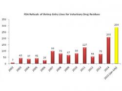 Through the first seven months of 2015, the FDA has now refused a total of 286 entry lines of shrimp products for reasons related to banned antibiotics. As shown in the chart below, the amount of entry line refusals so far this year substantially exceeds the number of refusals historically reported by FDA. In fact, with five months left in the year, the FDA has already refused more shrimp entry lines for banned antibiotics in 2015 than it reported in total during the six-year time period spanning from 2002 through 2007 (246). Moreover, while 2014 was the previous record year for such entry line refusals, the number of refusals reported for this year thus far exceeds the cumulative total reported by the FDA in 2013 and 2014 (283).