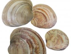 The hard clam is a brown, nearly oval-shaped bivalve mollusk with a thick, hard shell that protects the meat. The shell can grow to a width of 4 1/2 inches and is marked by rings or ridges that indicate the clam’s growth and age, which can be more than 30 years. There are two commercially important varieties of hard clams harvested in Florida, the northern quahog (Mercenaria mercenaria) and the southern quahog (Mercenaria campechiensis).