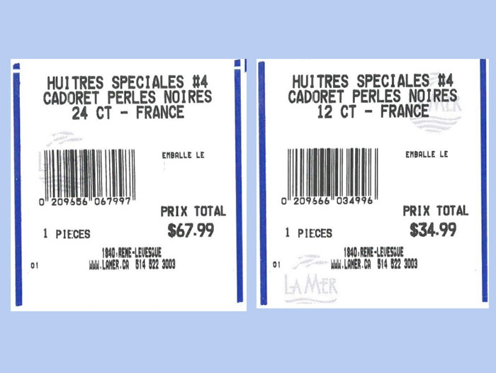 | Les Huîtres Cadoret – La Perle Noire | “Huitres speciales #4 Cadoret Perles Noires 24 CT – France” | 24 count | 0 209656 067997 | “Emballe le”13.FE.20 |