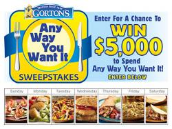 Entrants in the Gorton's Seafood “Any Way You Want It” promotion will have the opportunity to win $5,000 to spend “Any Way You Want It” just before the holidays. One entrant will be selected at random in early December. Two runners up will win $500 each. Additionally, during the promotion period, Gorton’s will be giving out 800 custom Gorton’s dinner plates that remind consumers to “eat seafood twice a week”.