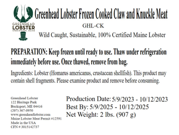 BUCKSPORT – Greenhead Lobster Products is voluntarily recalling all frozen and refrigerated cooked lobster meat products produced from May 9, 2023, through October 19, 2023, due to the potential for the product to be contaminated by Listeria monocytogenes.