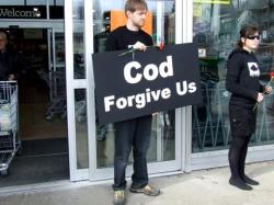 A small group of black-clad Greenpeace campaigners startled grocery shoppers in downtown Halifax today when they drove a hearse to the doors of the Queen Street Sobeys and unloaded a coffin containing the head of an Atlantic cod.