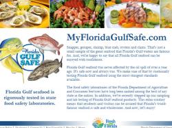 The Florida Department of Agriculture and Consumer Services is working to increase consumer confidence by raising awareness among consumers for the proven safety of Gulf seafood through the “Florida Gulf Safe” campaign. The Department has partnered with Florida Outdoor Advertising Association to communicate this message on billboards statewide and with the Florida Department of Transportation to reach travelers on Florida’s Turnpike via tollbooth signs. Full-page ads will appear in magazines that target chefs and restaurateurs, as well as in upscale consumer magazines. Tabletop displays will be distributed to restaurants and seafood retailers to reach consumers where they shop.