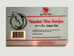 Number One Sompa Salted Fish is contained in a clear vacuum packaged pouch. The pouch contains red and black lettering with a fish logo on the left hand portion. The product is a 7-ounce package containing a whole processed Tin Foil Barb fish, UPC: 8 8433200019 4.