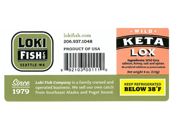 The Keta Salmon Lox is packaged in a 4 oz. plastic package on a coated board. It is labeled as Wild Keta Lox, Loki Fish Co., Seattle, WA. There are no best by dates on the package.