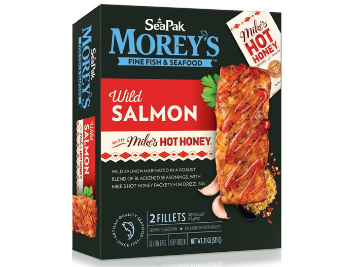 Each package of Morey’s Wild Salmon with Mike’s Hot Honey features two individually wrapped 5-ounce fillets and two packets of Mike’s Hot Honey. It is naturally gluten-free and line priced with Morey’s core frozen products.