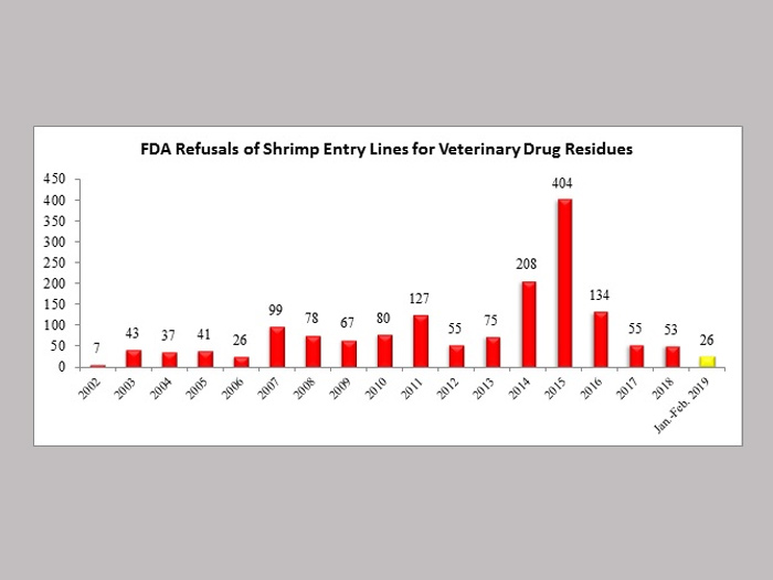 The table summarizes shrimp entry line refusals for reasons related to veterinary drug residues from 2002 through February 2019.