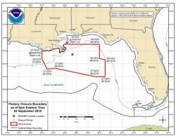 Effective September 2, 2010 at 6 p.m. eastern time (5 p.m. central time), NOAA will reopen 5,130 square miles (8,256 sq km) of area it had previously closed to commercial and recreational fishing in the Gulf of Mexico in response to the BP/Deepwater Horizon oil spill. The area off the Florida panhandle that was previously open only for finfish, is now open for all fishing.
