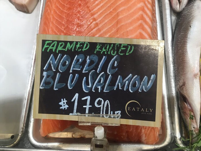 Nordic Blu Salmon is called out by name at Eataly fresh counters, on their restaurant menus, and is now the only Atlantic salmon the stores will offer.