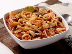 The seafood in the albondigas item is an Alaska cod and shrimp seafood meatball in a tomato chili broth made with traditional Mexican chilies and flavors. Cioppino consists of Alaska cod, calamari, mussels, and shrimp in a rich tomato and wine broth. The jjamppong has Alaska cod, shrimp, mussels, and squid with udon noodles and vegetables in a spicy broth.