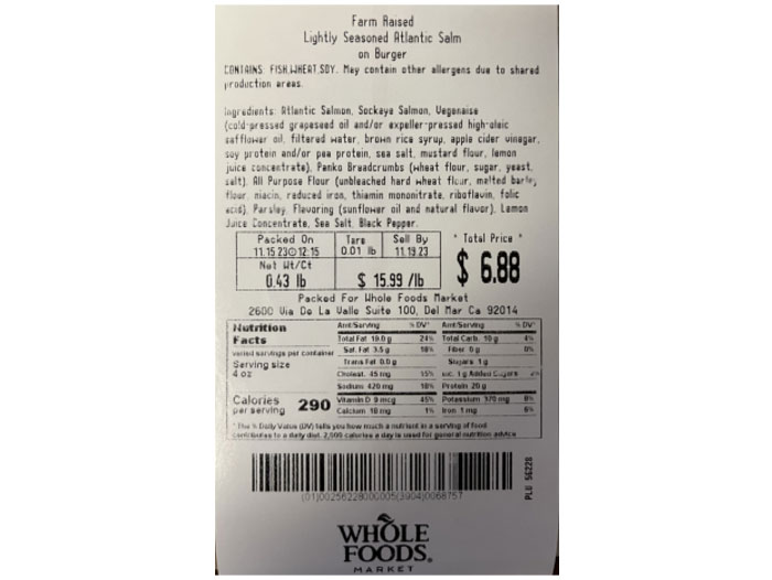 The recalled product was sold in the seafood department of Whole Foods Market stores nationwide from August 25, 2023 through November 15, 2023. This product was sold from the seafood service case wrapped in paper or prepackaged in clear trays displaying PLU 56228: