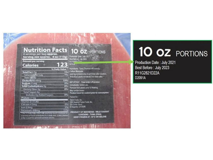 Product was distributed in Northern California and made for sale at Save Mart Supermarkets and Lucky Stores from October 6th, 2021 potentially up to December 27th, 2021. Product was sold to consumers as frozen 10 oz tuna steaks. 10 oz tuna steaks sold individually would have been labeled with the following dates and production code: Production Date : July 2021 Best Before : July 2023 R11G2821D22A D2091A. This information can readily be found on the packaging of the individual tuna steaks in the top right corner: