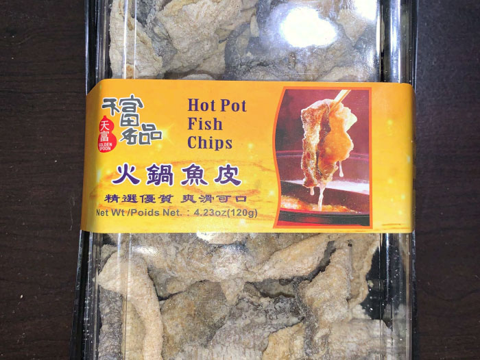 • 4.23 oz. (120g) plastic tray and cover packages containing “Golden Spoon Hot Pot Fish Chips”.
