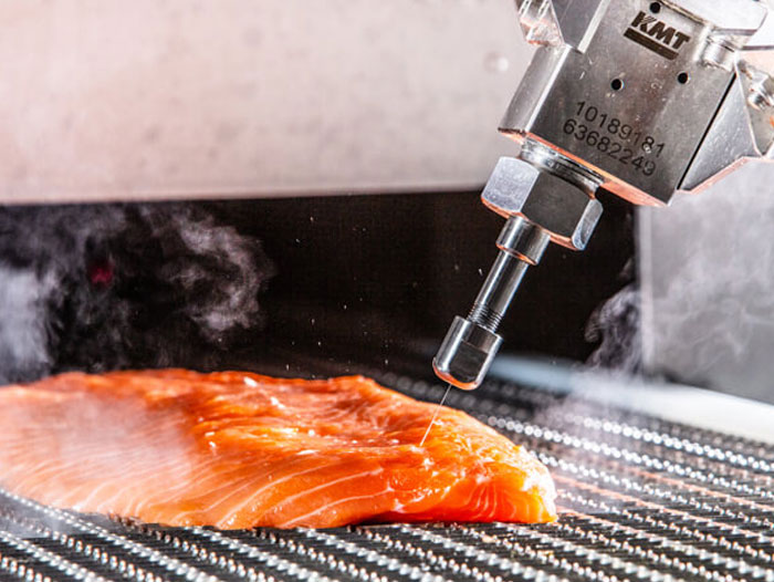In an effort to accommodate the various states salmon fillets may be in at the time of processing, the Valka Cutter engages a number of different tools. Both pre-rigor and post rigor fillets can be handled. Through the use of tilted 2D and dynamic 3D water jet robots complex optimizations tasks can be performed. And both skin on and skinless fillets are held firmly in place during portioning with a unique serrated steel belt.