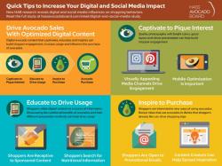 The top tip for successful digital content is to ensure that it captivates the consumer. To help build shopper engagement and influence purchases, retailers can create mobile-optimized digital content that features quality photography, bright colors and a clever presentation. Engaging content piques interest, draws attention and motivates shoppers to purchase. Pinterest and Instagram are examples of visually appealing social media sites that utilize color and eye-catching layouts. When an image features a Hass avocado, it’s important that the color be bright and prominent to connote freshness.