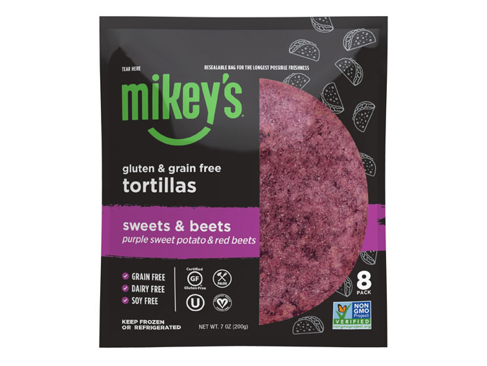 BETHLEHEM, Pa. – Mikey’s, the pioneer in Frozen gluten and dairy free foods, introduces their NEW vegetable-based superfood tortillas which are an innovative, colorful addition to the Mikey’s product line. They are crafted with clean, high-quality ingredients and superfoods like spirulina, turmeric, and hemp protein, redefining the classic flour-based tortilla. The initial launch has three varieties; Mikey’s Sweets & Beets Gluten and Grain-Free Tortillas, made with purple sweet potato and beets, Mikey’s Golden Turmeric Gluten and Grain-Free Tortillas, made with turmeric and hemp protein, and Mikey’s Super Greens Gluten and Grain-Free Tortillas, made with spinach, broccoli, and spirulina.