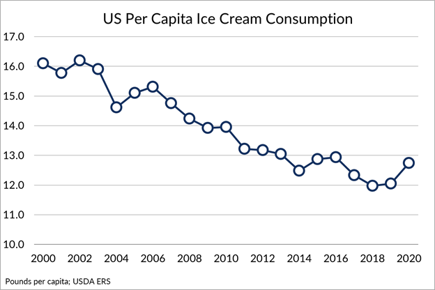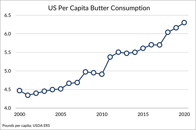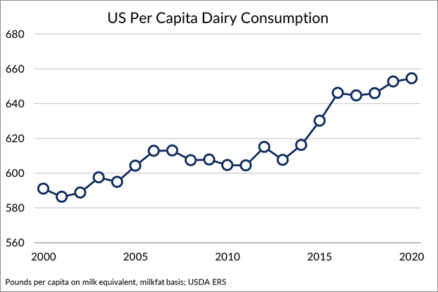 Ice cream continued to rebound and grew by 6% year-over-year in 2020. Meanwhile, yogurt consumption jumped 3% and butter notched a 2% increase. Milk and cheese remained resilient throughout 2020 despite the closure of restaurants, cafes, schools, and other institutions that drive demand. Overall, ERS data show American dairy consumption continuing its growth trajectory. Since USDA began tracking dairy consumption in 1975, per capita consumption has grown 22%.
