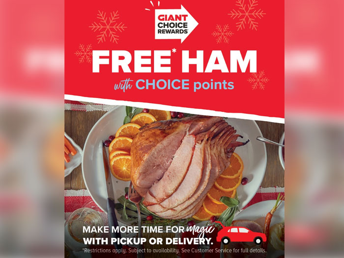 Customers who earn 400 rewards points from Nov. 27 through Dec. 24 can choose to redeem their points for a certificate for a free GIANT brand spiral sliced half ham. Paper and digital reward certificates can be redeemed from Dec. 11 through Dec. 24 at any GIANT or MARTIN’S location, or online via GIANT Direct or MARTIN’S Direct. Customers can also choose to substitute their free ham certificate towards a free Stouffers party size entrée or tofurkey vegetable ham roast or for $1 off per pound of the boneless ham brand of their choice.