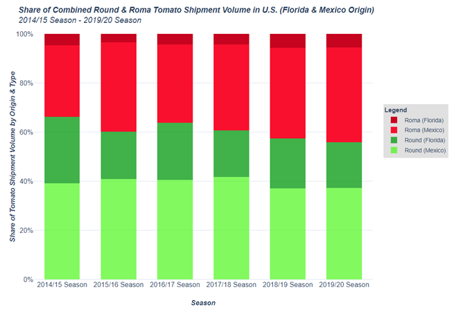 The charts below were highlighted throughout the study as they are a strong example of the impact that the COVID-19 pandemic had on fresh tomatoes.